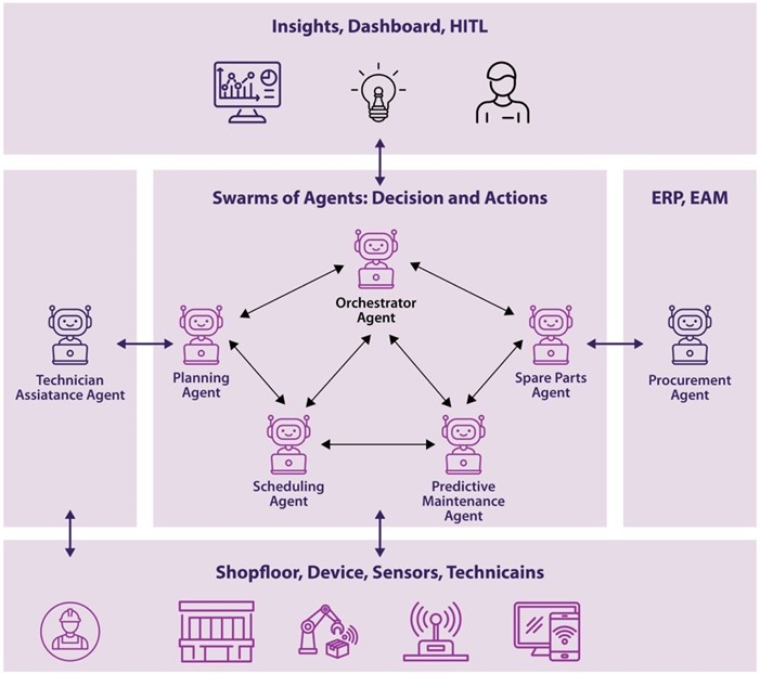As manufacturers pursue greater levels of automation and operational efficiency, agentic swarms-networks of intelligent, intercommunicating AI agents are transforming traditional maintenance models. These agentic swarms continuously assess equipment conditions, detect irregularities in real time, planning and scheduling of asset maintenance, managing spare parts and helping maintenance technicians by interacting, instructing and providing insights. The result is a shift from reactive, human-centered interventions to predictive and adaptive maintenance models, reducing downtime and enhancing asset utilization.